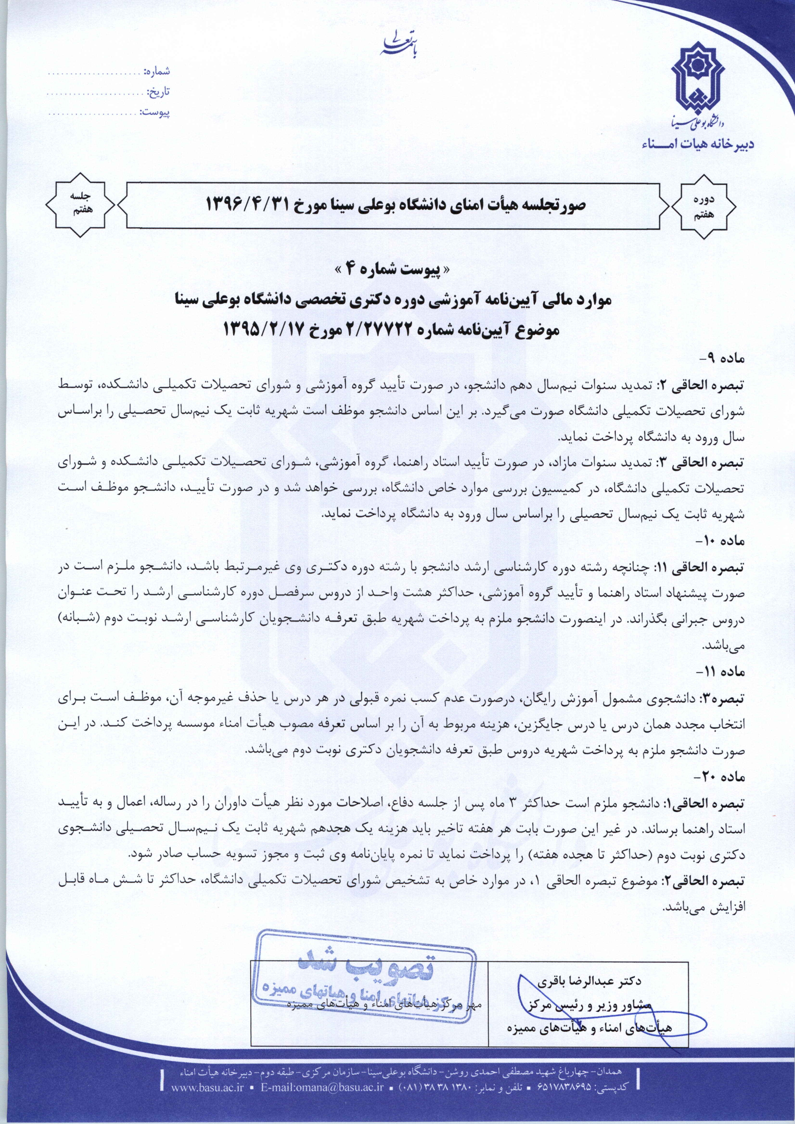 صورتجلسه چهارمین نشست عادی از دوره هشتم هیئت منای دانشگاه بوعلی سینا مورخه 1399/5/21